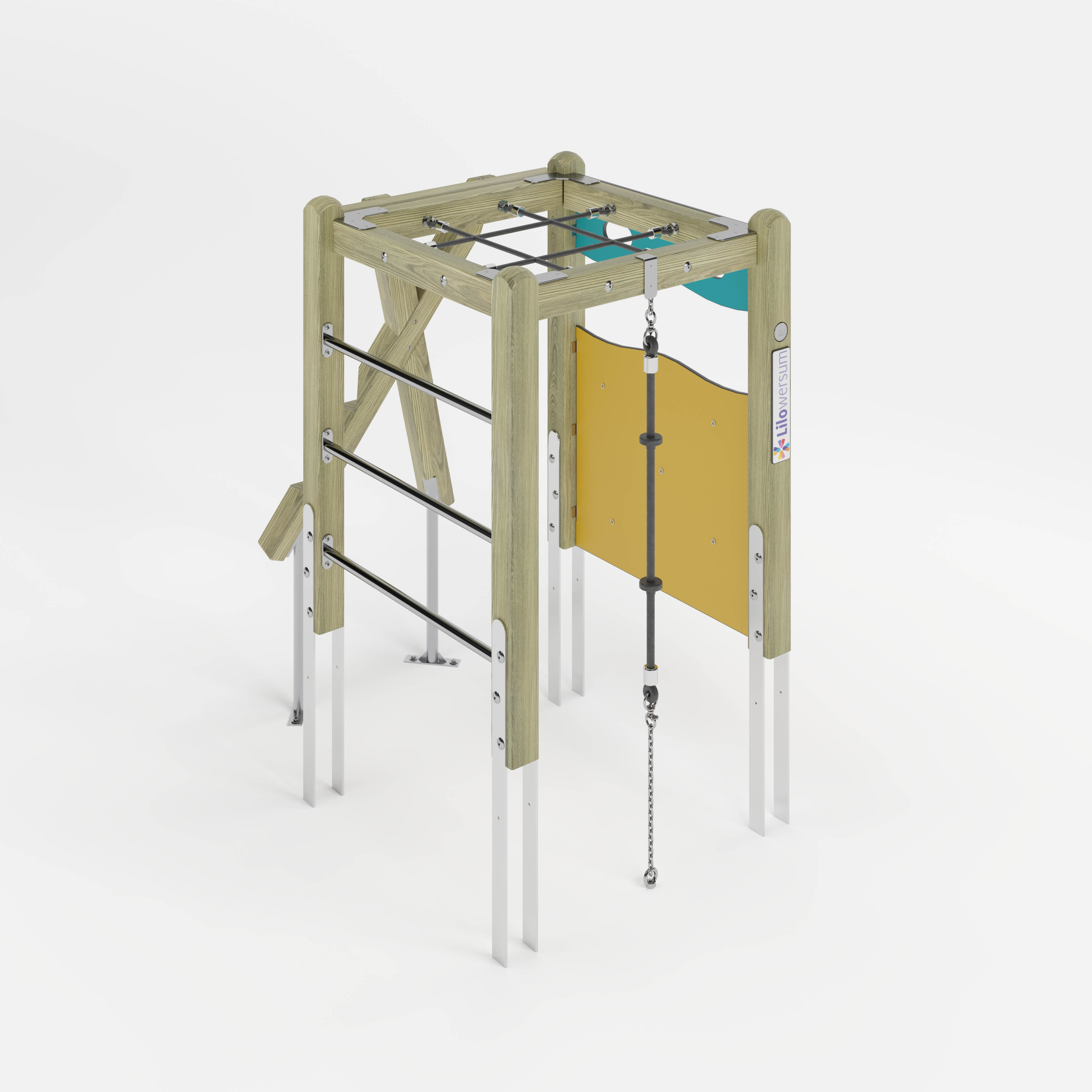 4x Pfostenkonstruktion: Nadelholz oder Stahl 1x Netzrahmen: Nadelholz, Hochdrucklaminat (HPL) , kunststoffummanteltes Stahlseil1x Kletterplatte: Hochdrucklaminat (HPL) , Glasfaserverstärkter Kunststoff (GFK) 1x Kletterplatte: Hochdrucklaminat (HPL) 1x Leiter senkrecht: Edelstahl (V2A) 1x Tellertau: kunststoffummanteltes Stahlseil, Edelstahl (V2A), Kunststoff1x X-Aufstieg: Nadelholz 1x Kantholz: Nadelholz Beschläge: Edelstahl (V2A) |