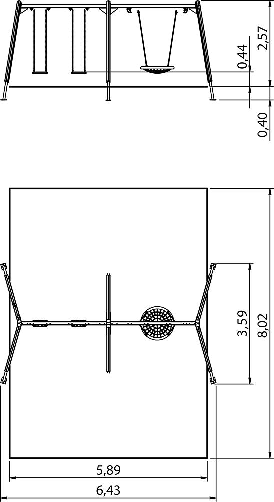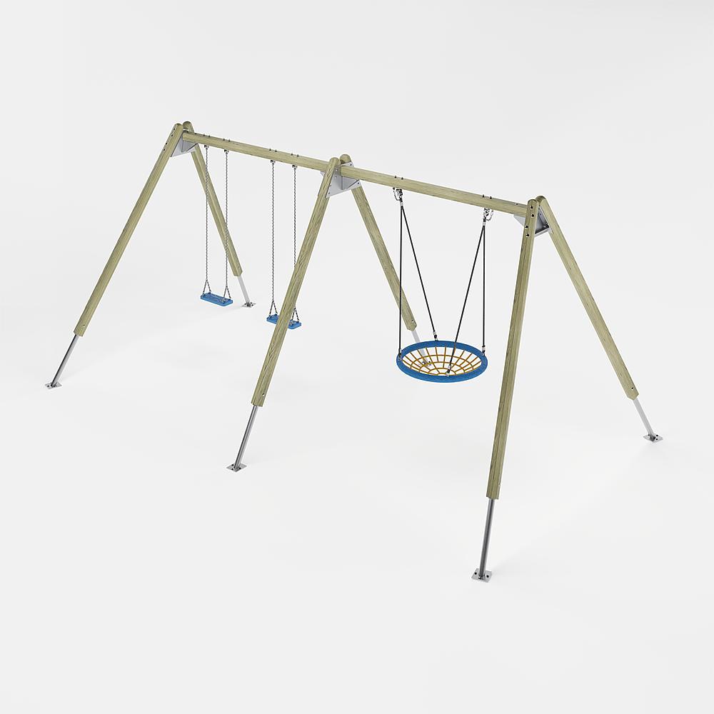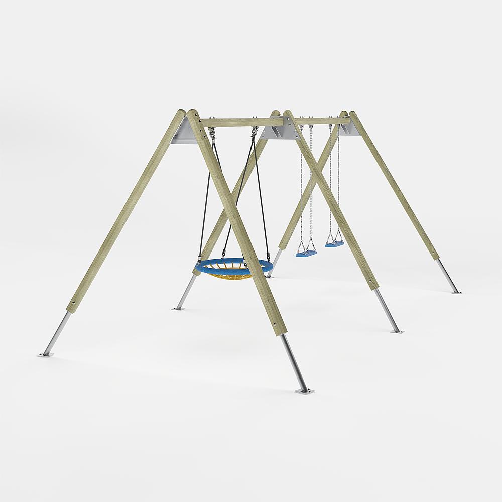 | Lieferumfang | 6x Pfosten mit Ständerfüßen: NH, Stahl feuerverzinkt 2x Schaukelbalken: Stahl feuerverzinkt 4x Schaukelgelenke: Stahl verzinkt 2x Sicherheitsschaukelsitze mit Ketten: Gummi, Edelstahl 2x Kardangelenke: Stahl verzinkt 1x Nesthocker Ø 100: Stahl verzinkt, kunststoffummanteltes Stahlseil |