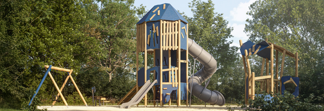 Die SCHEPPS-Serie setzt auf schiefe Pfosten, unregelmäßige Formen und ein bewusst „wildes“ Erscheinungsbild. Mit Lärche, Robinie und HPL gefertigt, vereint sie Robustheit mit lebendigem Design. SCHEPPS bringt Dynamik in jeden Spielplatz und ist besonders geeignet für naturnahe Areale mit kreativem Anspruch.