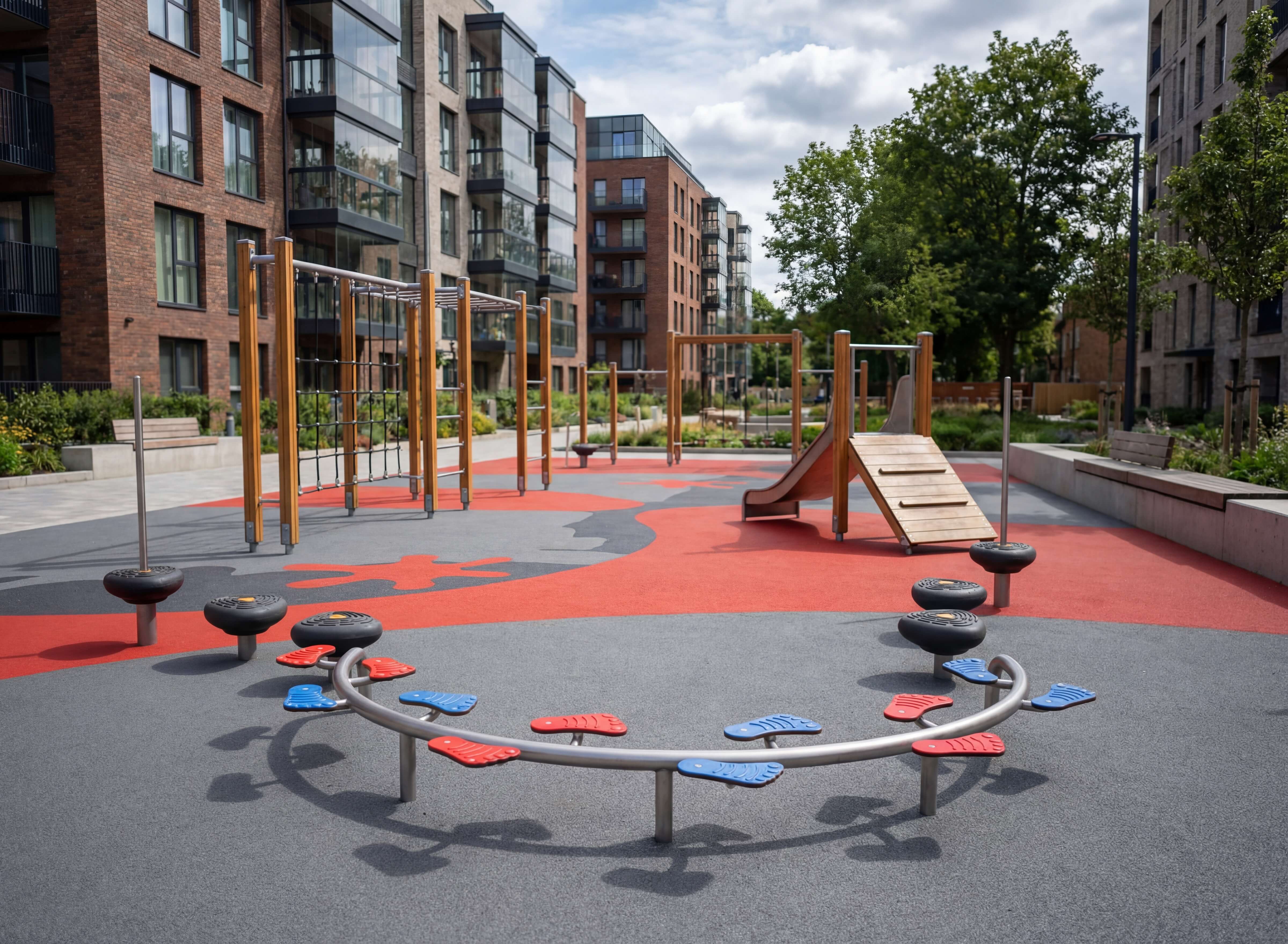 - Ausreichend dicken und gut verteilten Fallschutz sowie korrekte Abdeckung der Fundamente