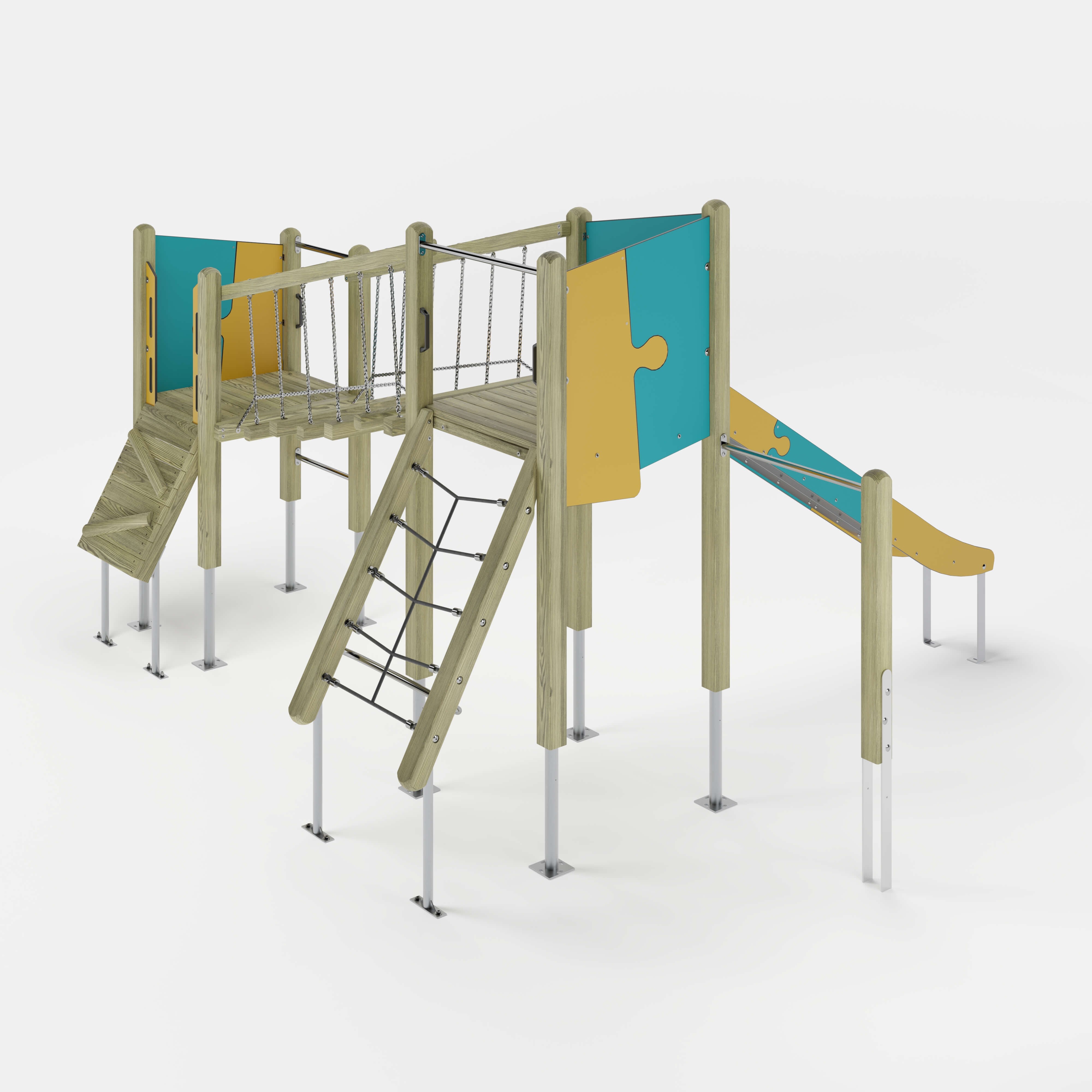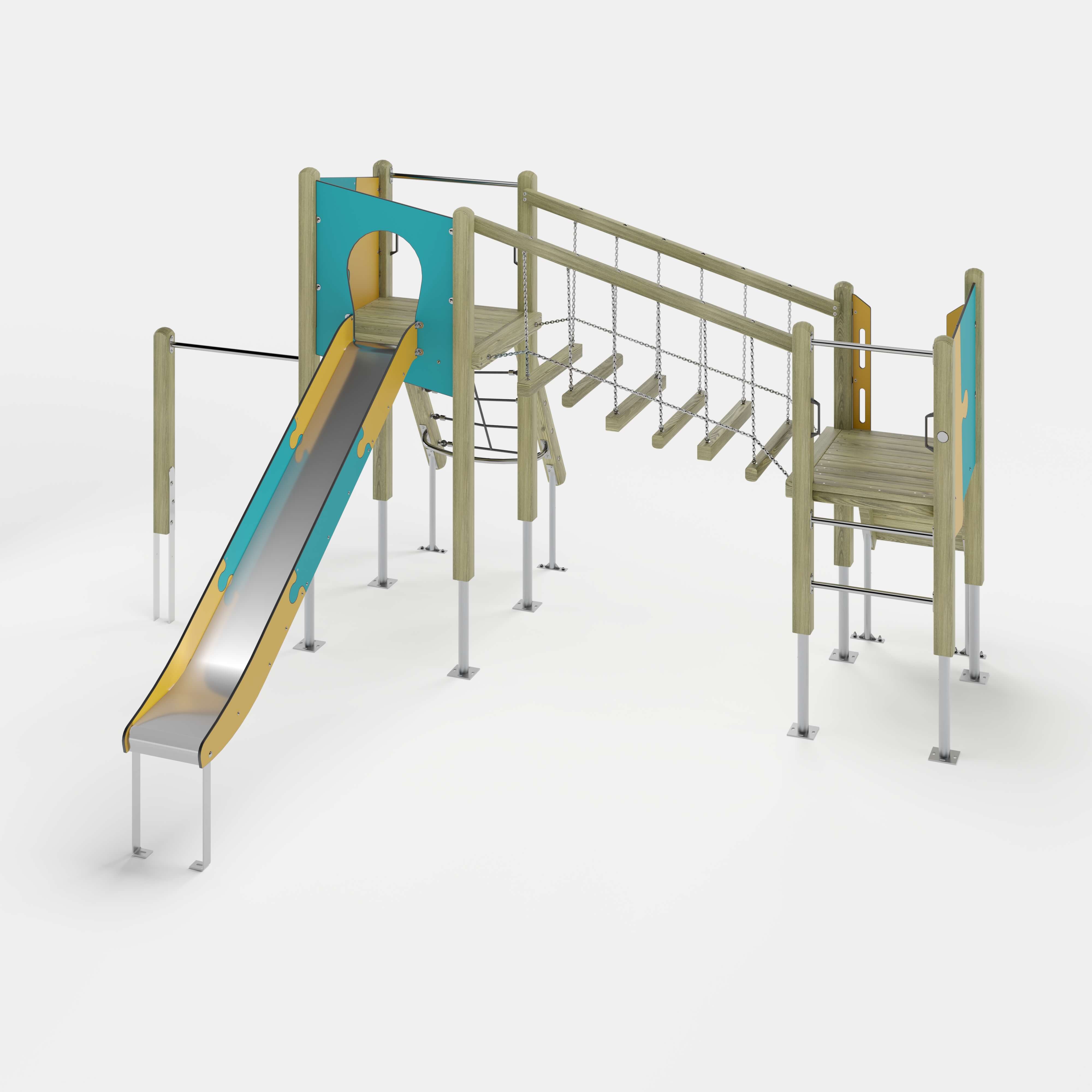 | Lieferumfang | 9x Pfostenkonstruktion: Nadelholz oder Stahl 2x Podestkonstruktion: Nadelholz 1x Leiter senkrecht: Edelstahl (V2A) 1x Netzaufstieg schräg: Nadelholz, kunststoffummanteltes Stahlseil, Edelstahl (V2A) 1x Rampe: Nadelholz 1x Wackelbrücke schräg: Nadelholz, Stahl feuerverzinkt 4x Brüstung: Hochdrucklaminat (HPL) 3x Durchlaufsicherung: Edelstahl (V2A) 1x Rutscheneinstiegsplatte: Hochdrucklaminat (HPL) 1x Zugangsverengung: Hochdrucklaminat (HPL) 2x Griffset: Aluminium, beschichtet 6x Seitenschutz: Hochdrucklaminat (HPL) 1x Rutsche: Edelstahl (V2A) Beschläge: Edelstahl (V2A) |
