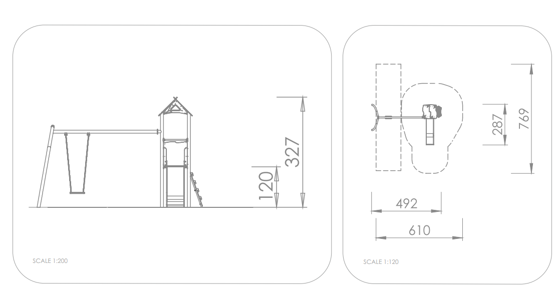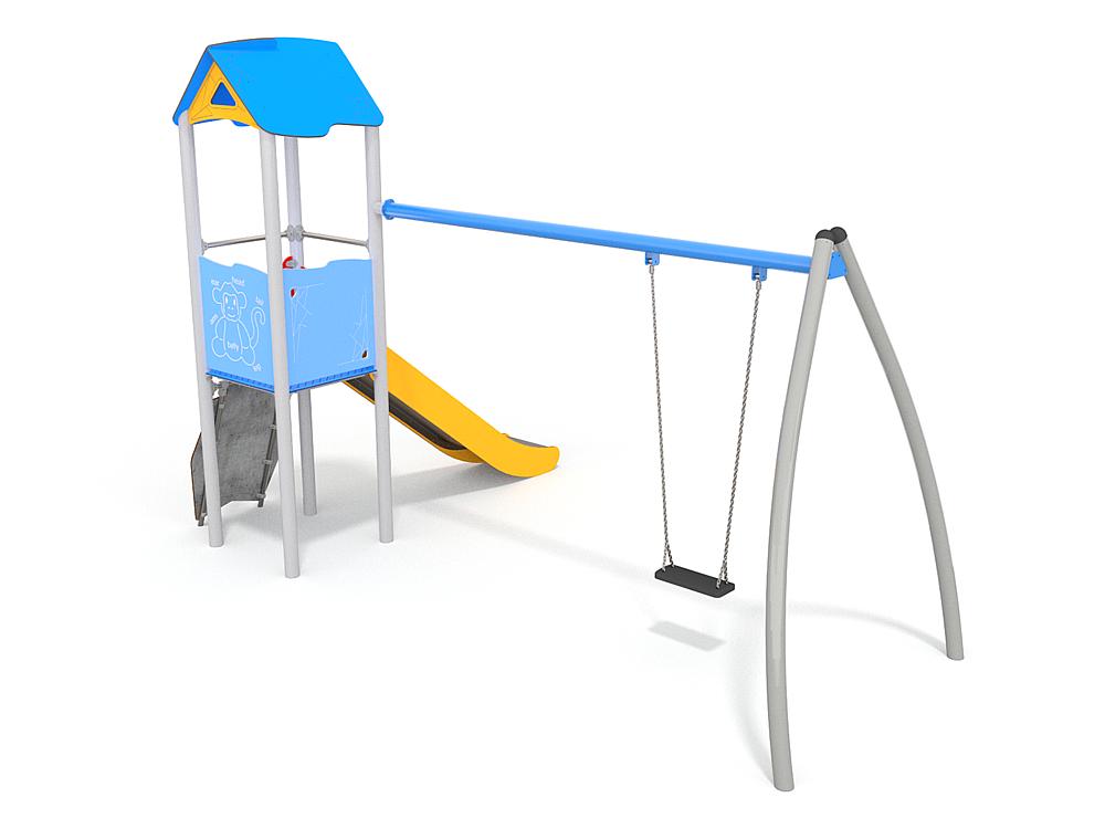 1x Spielturm mit Dach: Stahl Pulver, HDPE, Hochdrucklaminat (HPL), Edelstahl 1x Kletterrampe: Hochdrucklaminat (HPL), Polyester 1x Anbauschaukel: Stahl Pulver, Gummi 1x Rutsche PH 120 cm: Edelstahl, HDPE |