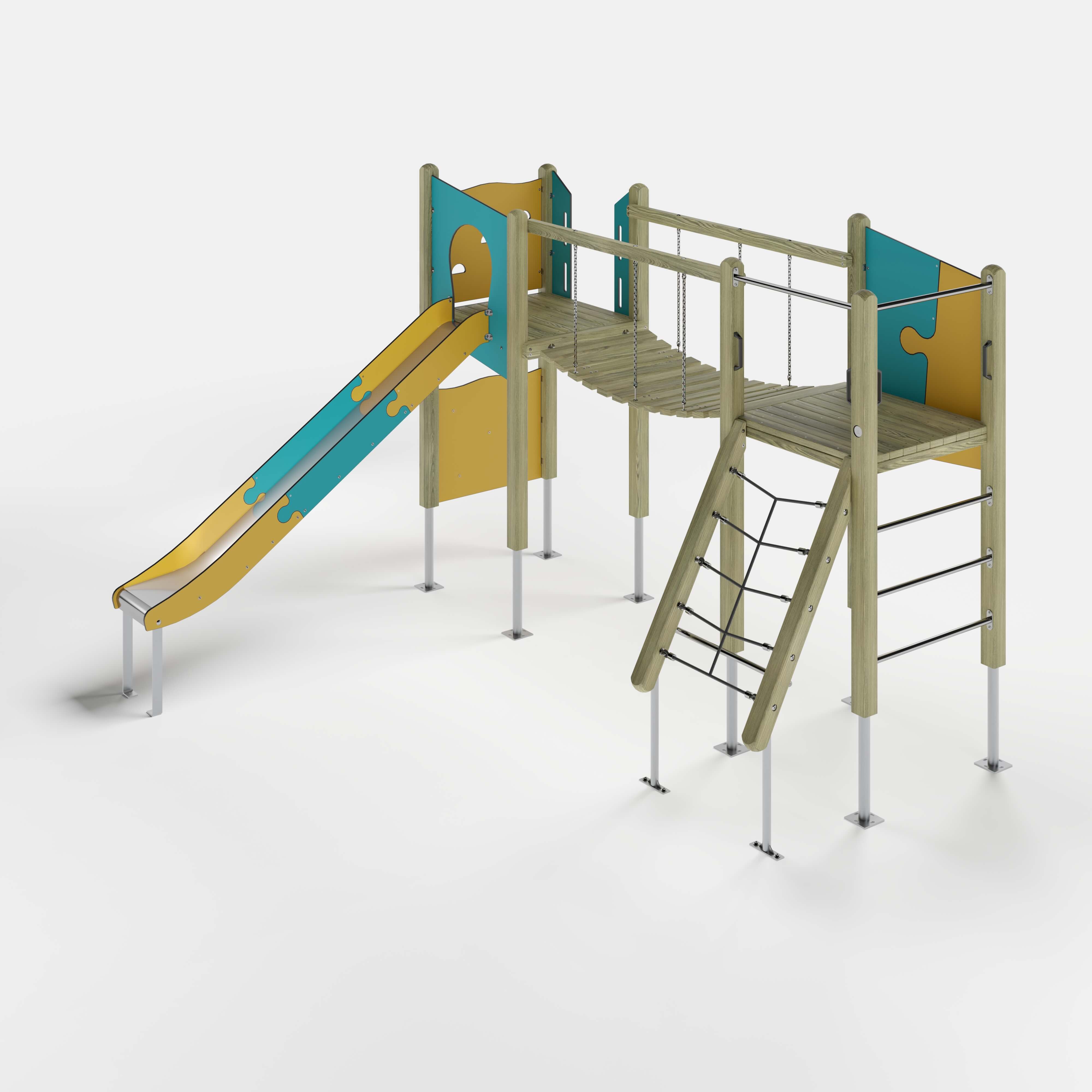 | Lieferumfang | 8x Pfostenkonstruktion: Nadelholz oder Stahl 2x Podestkonstruktion: Nadelholz 1x Kletterplatte: Hochdrucklaminat (HPL) , Glasfaserverstärkter Kunststoff (GFK) 2x Kletterplatte: Hochdrucklaminat (HPL) 1x Leiter senkrecht: Edelstahl (V2A) 1x Netzaufstieg schräg: Nadelholz, kunststoffummanteltes Stahlseil, Edelstahl (V2A) 1x Tellertau: kunststoffummanteltes Stahlseil, Edelstahl (V2A), Kunststoff 1x Hängebrücke gerade: Nadelholz, Stahl feuerverzinkt 1x Brüstung: Hochdrucklaminat (HPL) 2x Durchlaufsicherung: Edelstahl (V2A) 1x Zugangsverengung: Hochdrucklaminat (HPL) 2x Griffset: Aluminium, beschichtet 6x Seitenschutz: Hochdrucklaminat (HPL) 1x Rutsche: Edelstahl (V2A) Beschläge: Edelstahl (V2A) |