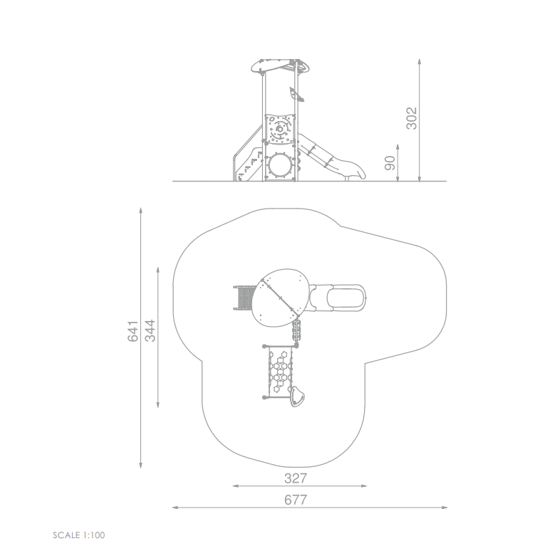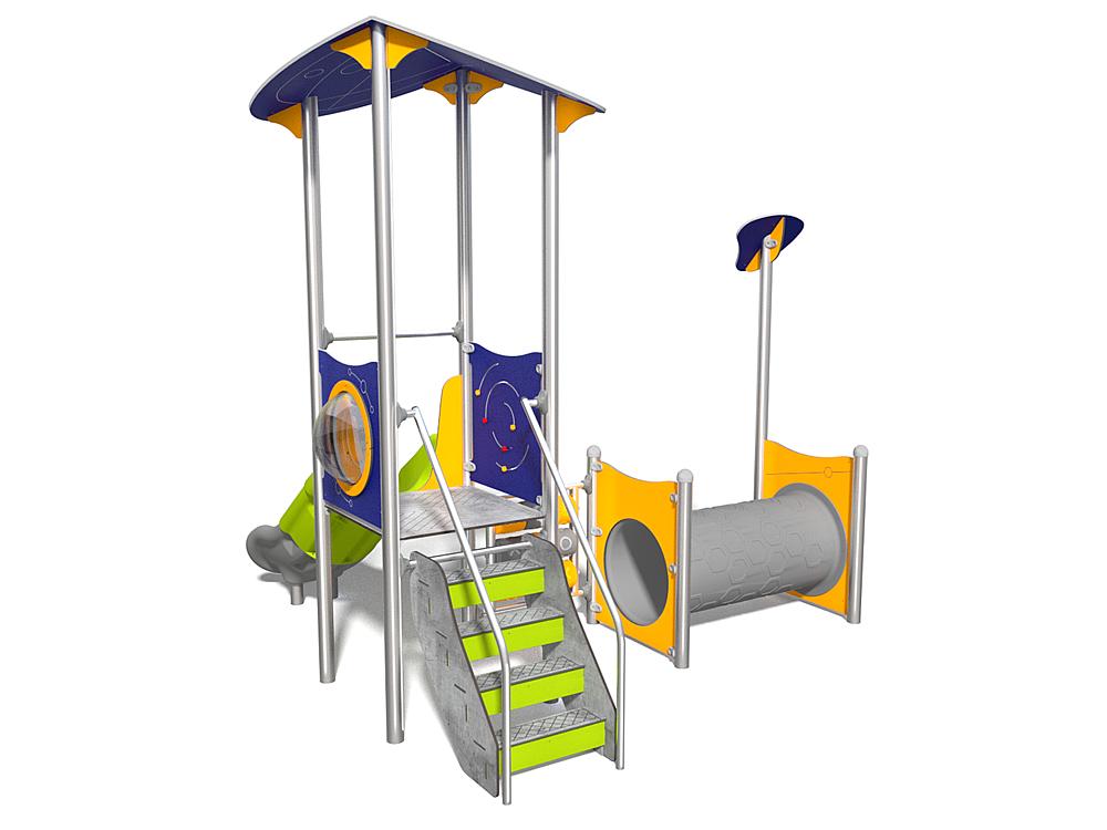 1x Spielturm mit Dach: Edelstahl, Hochdrucklaminat (HPL), HDPE 1x Spielbrüstung TicTacToe: Polyethylen, Edelstahl 1x Treppe: Hochdrucklaminat (HPL), Edelstahl 1x Kriechtunnel L=125 cm, Ø 53,3 cm: Polyethylen 1x Rutsche PH 90 cm: LDPE (Low-Density-Polyethylen) |