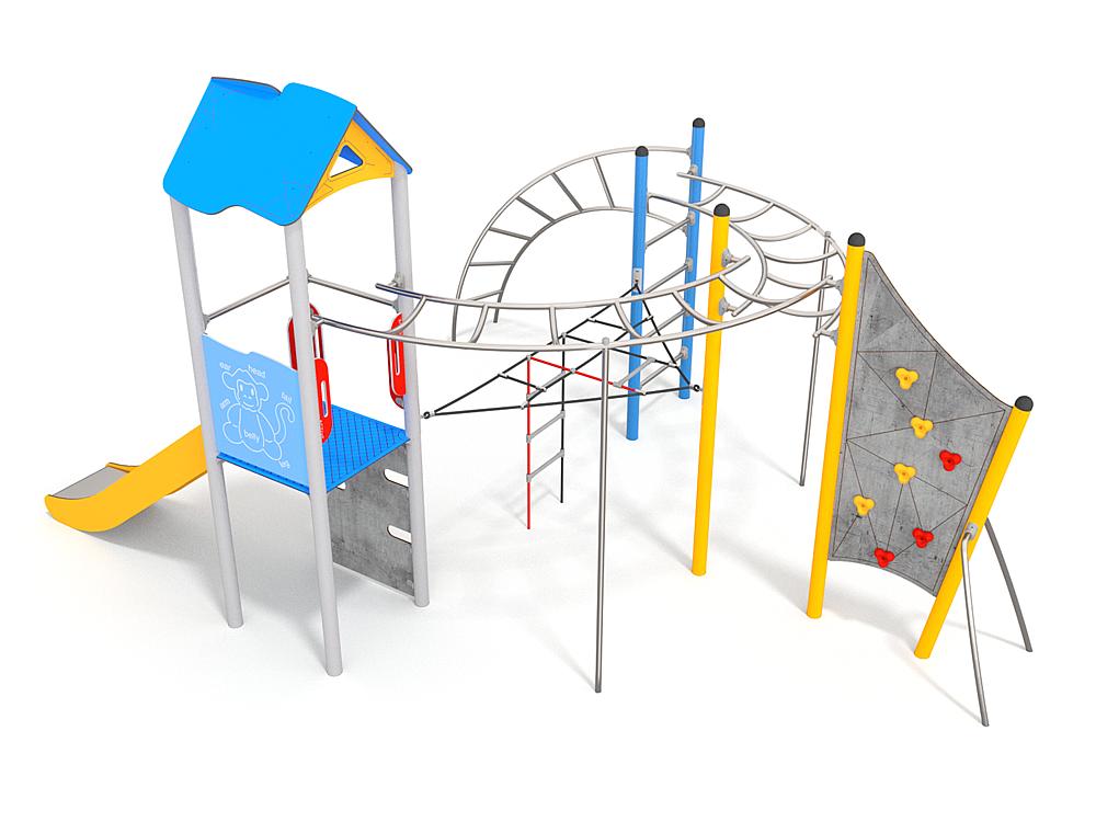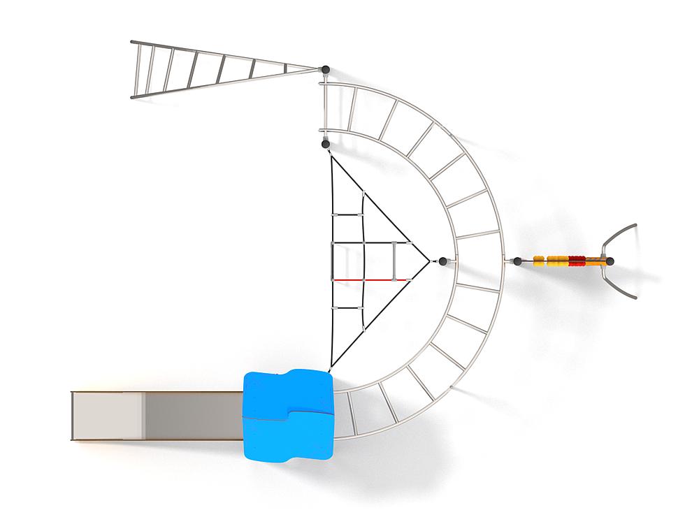 1x Spielturm mit Dach: Stahl Pulver, HDPE, Hochdrucklaminat (HPL), Edelstahl 1x Kletterplatte: Hochdrucklaminat (HPL), Polyester 1x Kletternetz 3eck: Polypropylen 2x Hangelleiter: Edelstahl 1x Kletterwand: Stahl Pulver, Hochdrucklaminat (HPL), Polyester 1x Sprossenleiter: Edelstahl, Stahl Pulver 1x Leiter gebogen: Edelstahl |