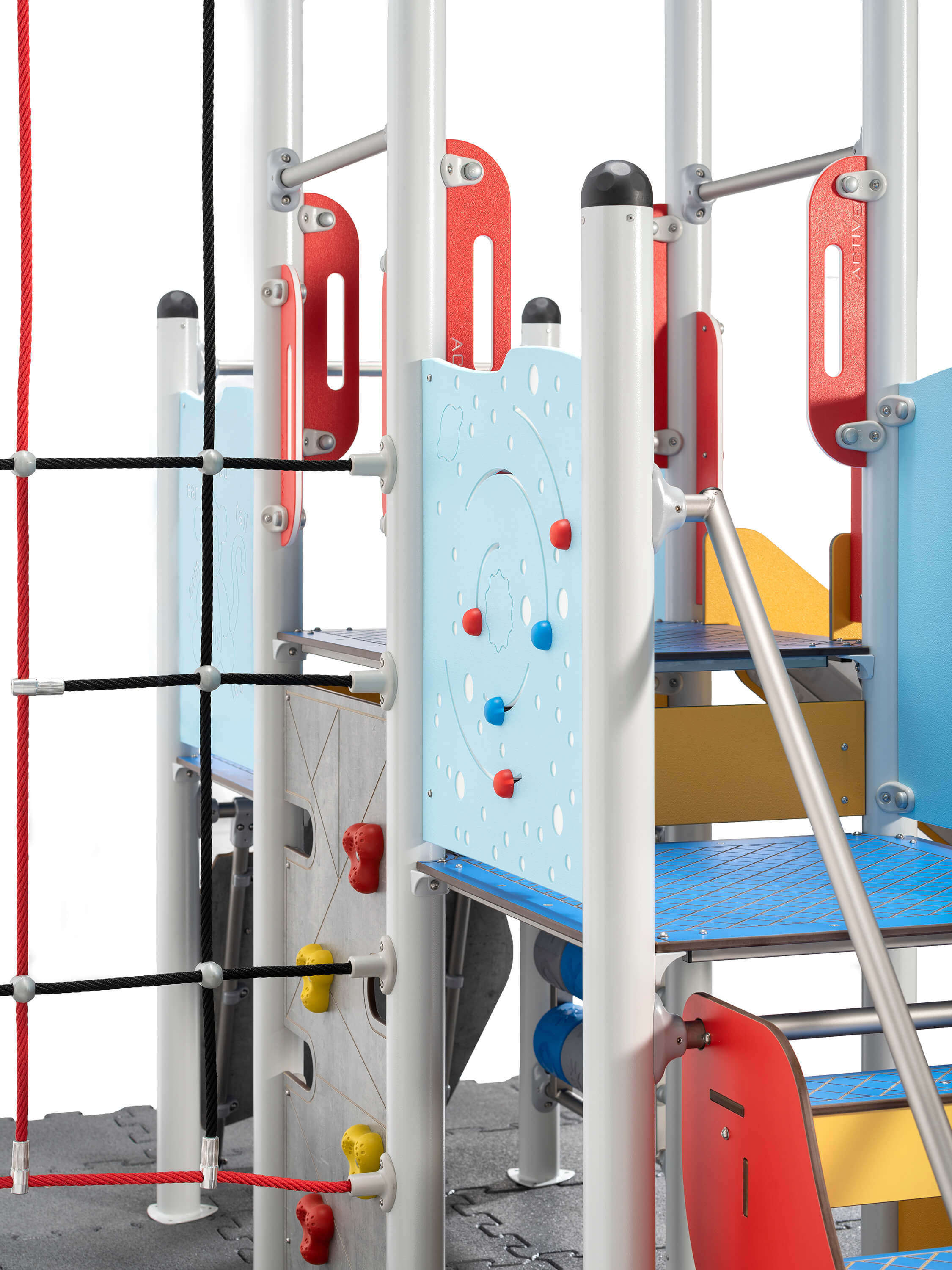 | Lieferumfang | 1x Spielturm mit Dach: Stahl Pulver, HDPE, Hochdrucklaminat (HPL), Edelstahl 1x Kletterrampe: Hochdrucklaminat (HPL), Polyester 2x Spielturm: Stahl Pulver, HDPE, Hochdrucklaminat (HPL), Edelstahl 1x Treppe: Hochdrucklaminat (HPL), HDPE, Edelstahl 1x Kletterplatte: Hochdrucklaminat (HPL), Polyester 1x Spieltheke: HDPE 1x Spielbrüstung TicTacToe: Polyethylen, Edelstahl 1x Kletternetz: Edelstahl, Polypropylen 1x Kletterwand: Stahl Pulver, Hochdrucklaminat (HPL), Polyester 1x Rutsche PH 120 cm: Edelstahl, HDPE |