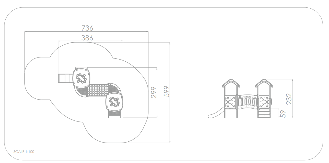 2x Spielturm 3eck mit Balkon: Edelstahl, Hochdrucklaminat (HPL), Stahl Pulver 2x Spielturm mit Dach: Edelstahl, Hochdrucklaminat (HPL), HDPE, Polyethylen 1x Brücke mit Netz: Hochdrucklaminat (HPL), HDPE, Polypropylen 1x Treppe: Hochdrucklaminat (HPL), HDPE 1x Rutsche PH 59 cm: HDPE, Polyester |