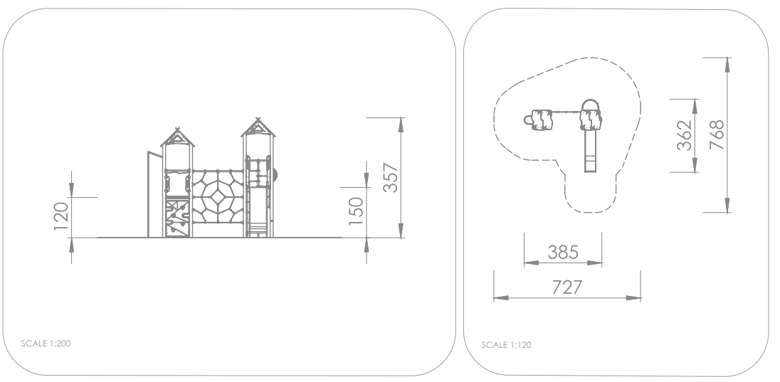 2x Spielturm mit Dach: Stahl Pulver, Edelstahl, Hochdrucklaminat (HPL), HDPE 1x Kletterplatte: Hochdrucklaminat (HPL), Polyester 1x Kletternetz: Polypropylen, Edelstahl 1x Netzkamin: Polypropylen 2x Sprossenleiter: Edelstahl 1x Rutschstange: Edelstahl 1x Rutsche PH 150 cm: Edelstahl, HDPE |
