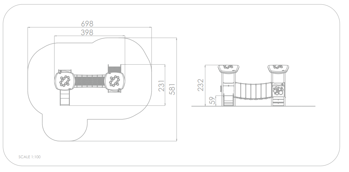 2x Spielturm mit Dach: Edelstahl, Hochdrucklaminat (HPL), HDPE, Polyethylen 1x Treppe: Hochdrucklaminat (HPL), HDPE 1x Wackelbrücke: Hochdrucklaminat (HPL), Polypropylen 1x Rutsche PH 59 cm: HDPE, Polyester |