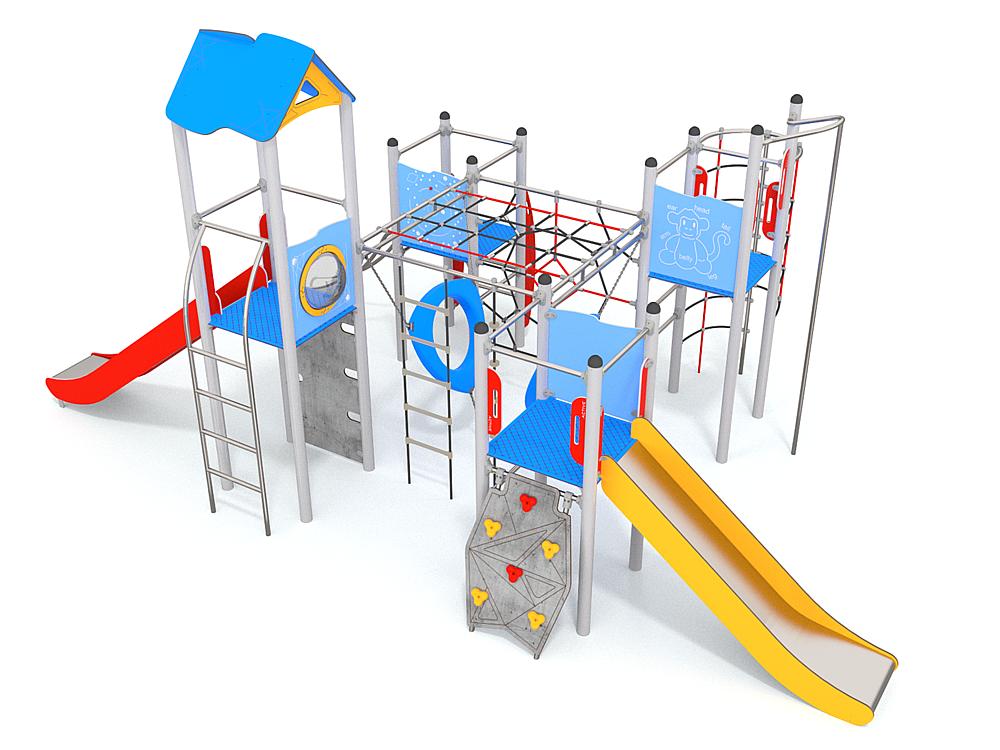 1x Spielturm mit Dach: Stahl Pulver, HDPE, Hochdrucklaminat (HPL), Edelstahl 3x Spielturm: Stahl Pulver, HDPE, Hochdrucklaminat (HPL), Edelstahl 1x Kletterplatte: Hochdrucklaminat (HPL), Polyester 1x Kletterrampe: Hochdrucklaminat (HPL), Polyester 1x Kletternetz: Polypropylen, Edelstahl 3x Sprossenleiter: Edelstahl 1x Sprossenleiter: Edelstahl, HPL 1x Leiter: Edelstahl 1x Netzkamin: Polypropylen 1x Kletterwürfel: Polypropylen, Polyethylen, Edelstahl 1x Rutschstange: Edelstahl 1x Handlaufrutsche: Edelstahl 1x Rutsche PH 150 cm: Edelstahl, HDPE 1x Rutsche PH 120 cm: Edelstahl, HDPE |