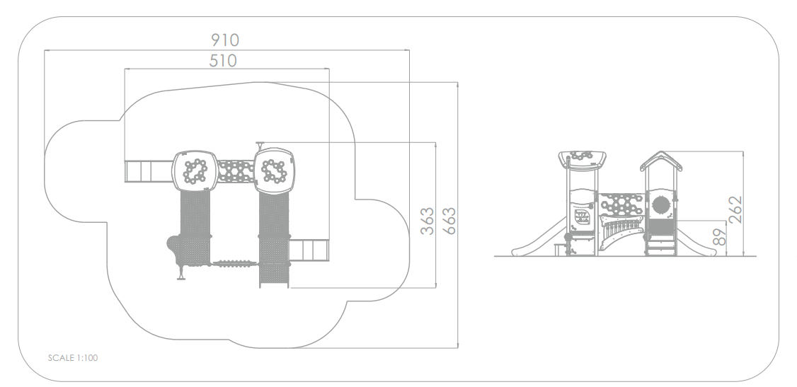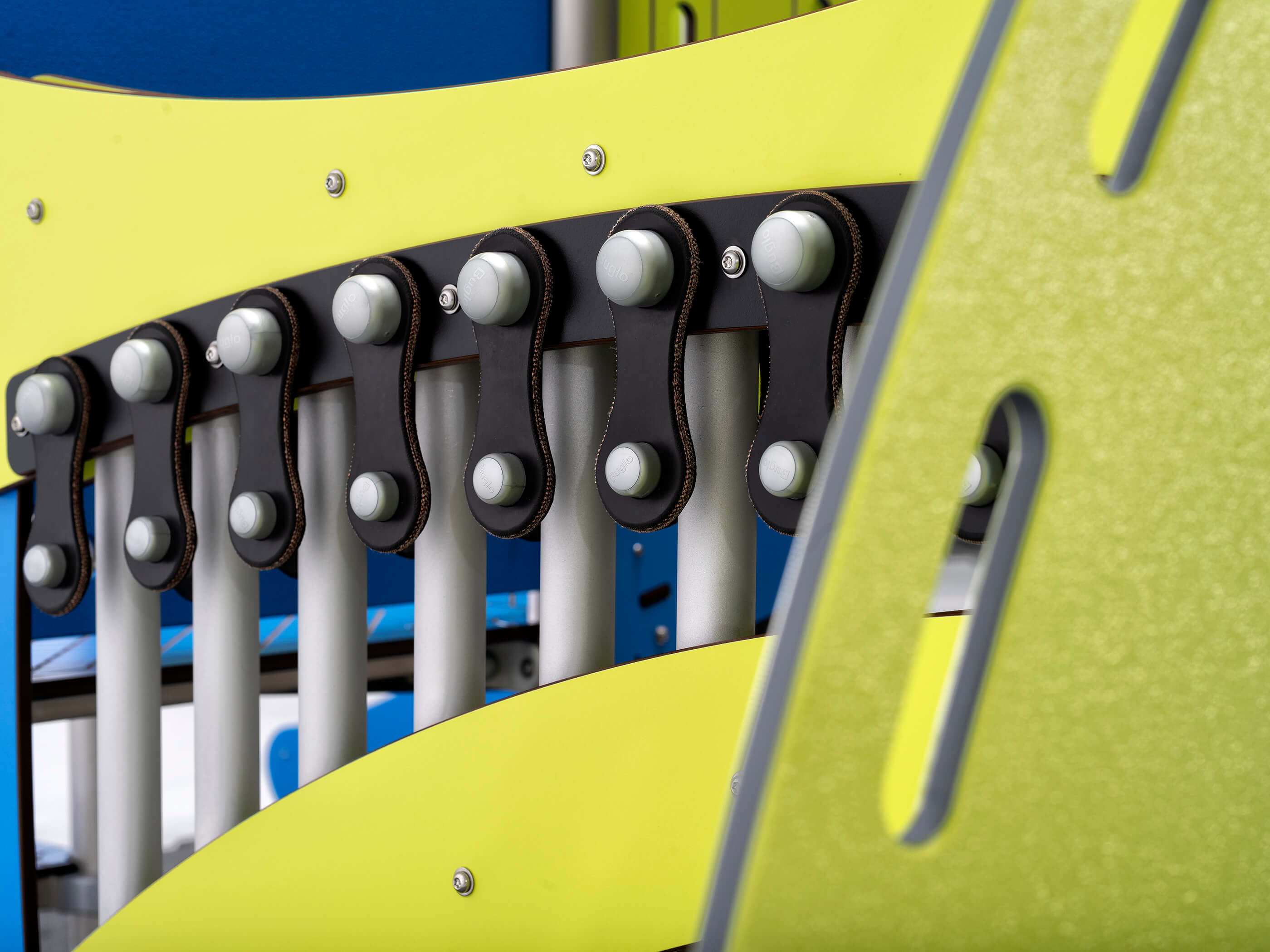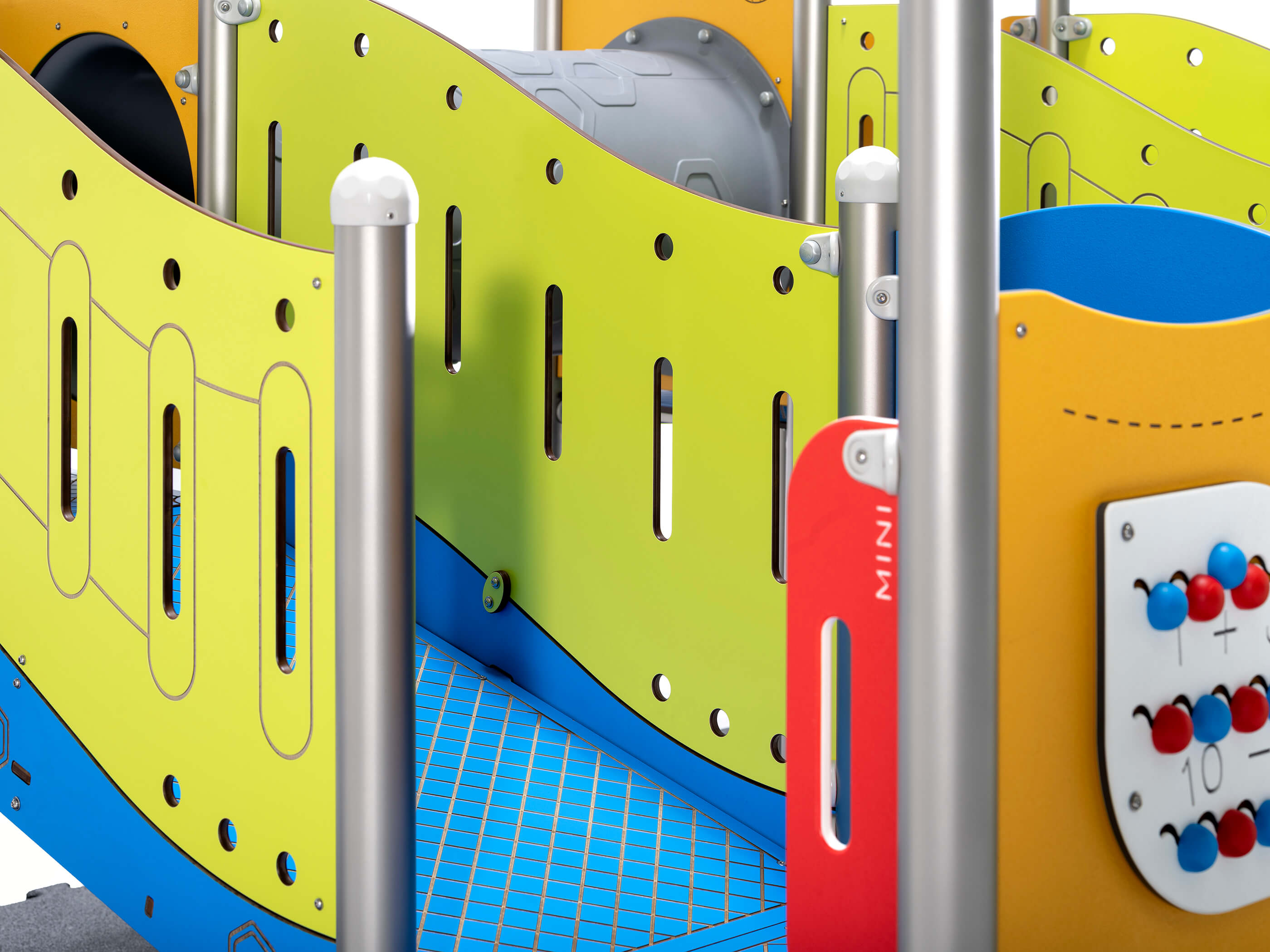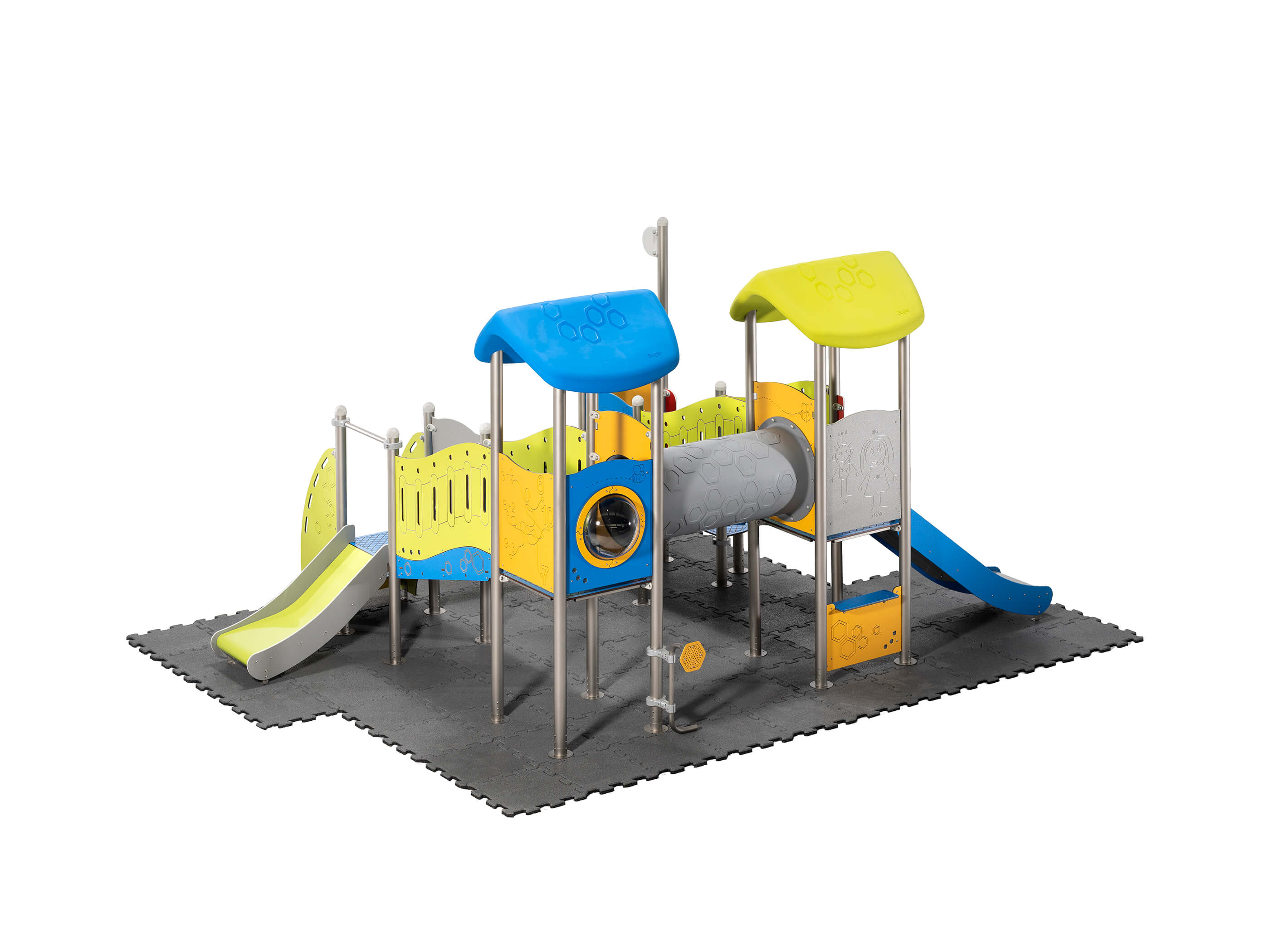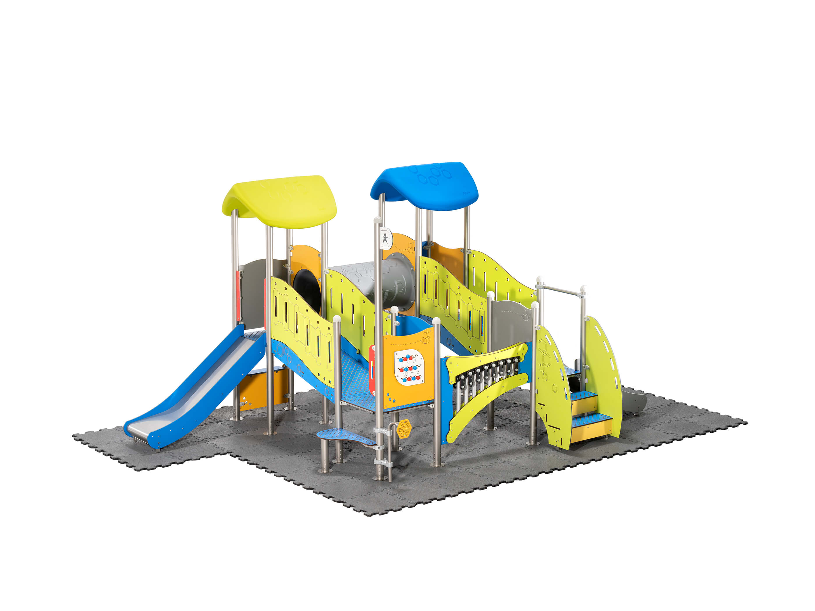 2x Spielturm mit Dach: Edelstahl, Hochdrucklaminat (HPL), HDPE, Polyethylene 2x Spielturm: Edelstahl, Hochdrucklaminat (HPL), HDPE 1x Trittstufe: Hochdrucklaminat (HPL) 1x Treppe: Hochdrucklaminat (HPL), HDPE 2x Rampe: Hochdrucklaminat (HPL) 1x Kriechtunnel L=125 cm, Ø 53,3 cm: Polyethylen 1x Spieltheke: HDPE 1x Xylophon: Hochdrucklaminat (HPL), Aluminium 2x Sprachrohrmodule: Edelstahl, HDPE 1x Rutsche PH 90 cm: HDPE, Polyester 1x Rutsche PH 59 cm: Edelstahl, HDPE |