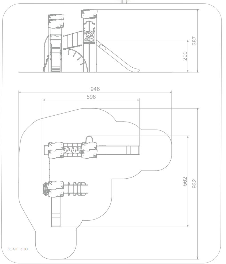 3x Spielturm mit Dach: Stahl Pulver, HDPE, Hochdrucklaminat (HPL), Edelstahl 2x Leiter: Edelstahl 1x Kletterplattform: Hochdrucklaminat (HPL), Polyester 1x Kletternetz: Edelstahl, Polypropylen 1x Wackelrampe: Hochdrucklaminat (HPL), Polypropylen 1x Rutschstange: Edelstahl 1x Rutsche PH 180 cm: Edelstahl, HDPE 1x Rutsche PH 120 cm: Edelstahl, HDPE |