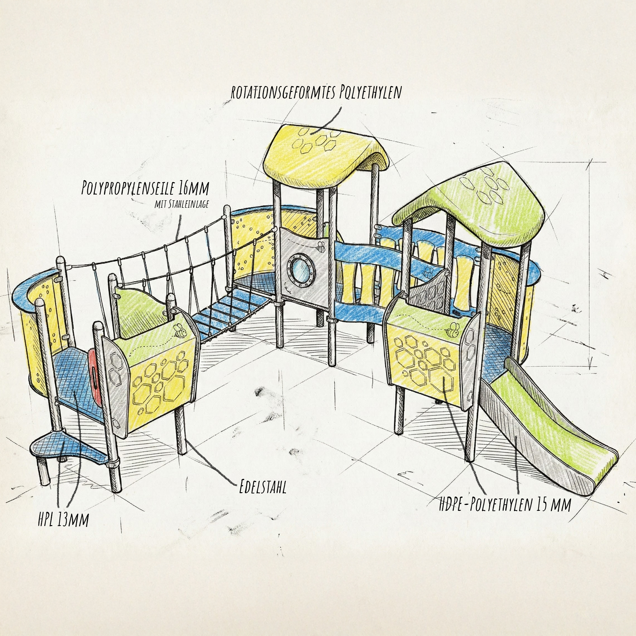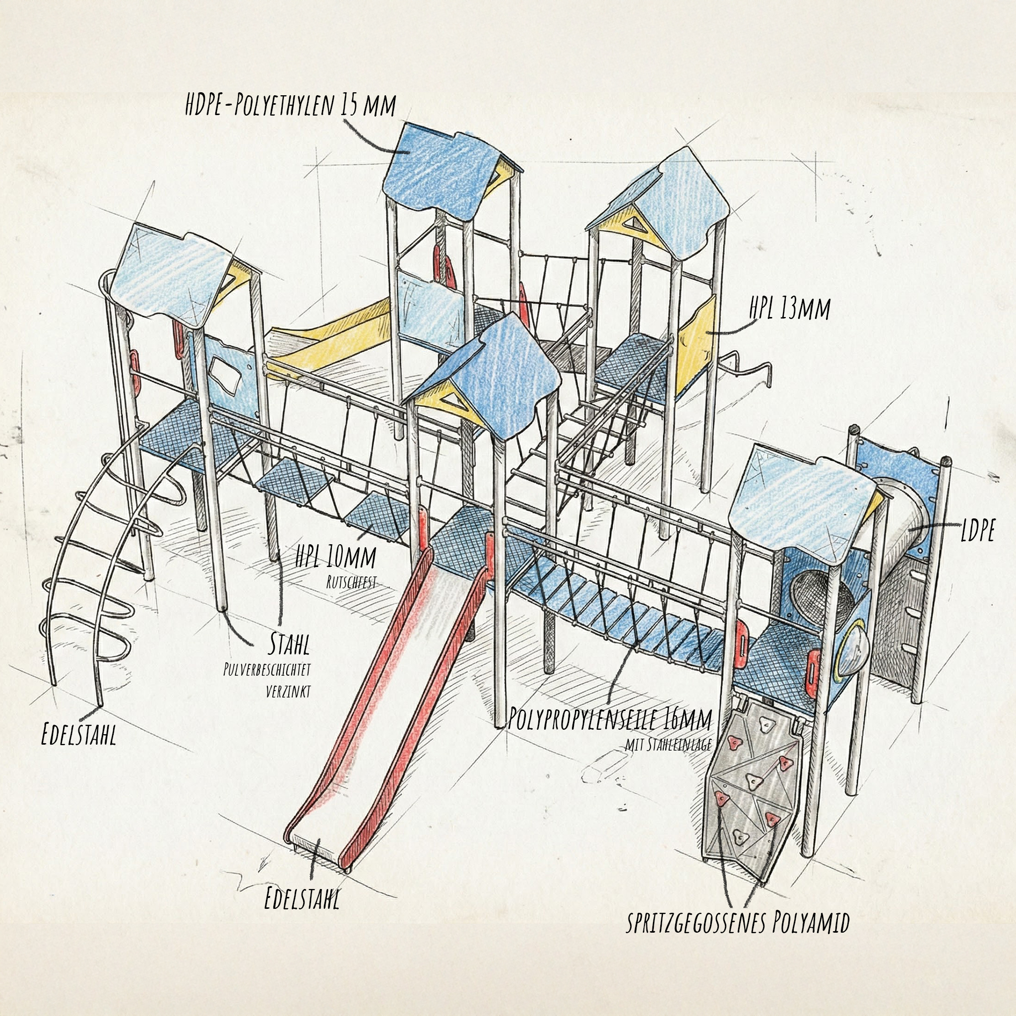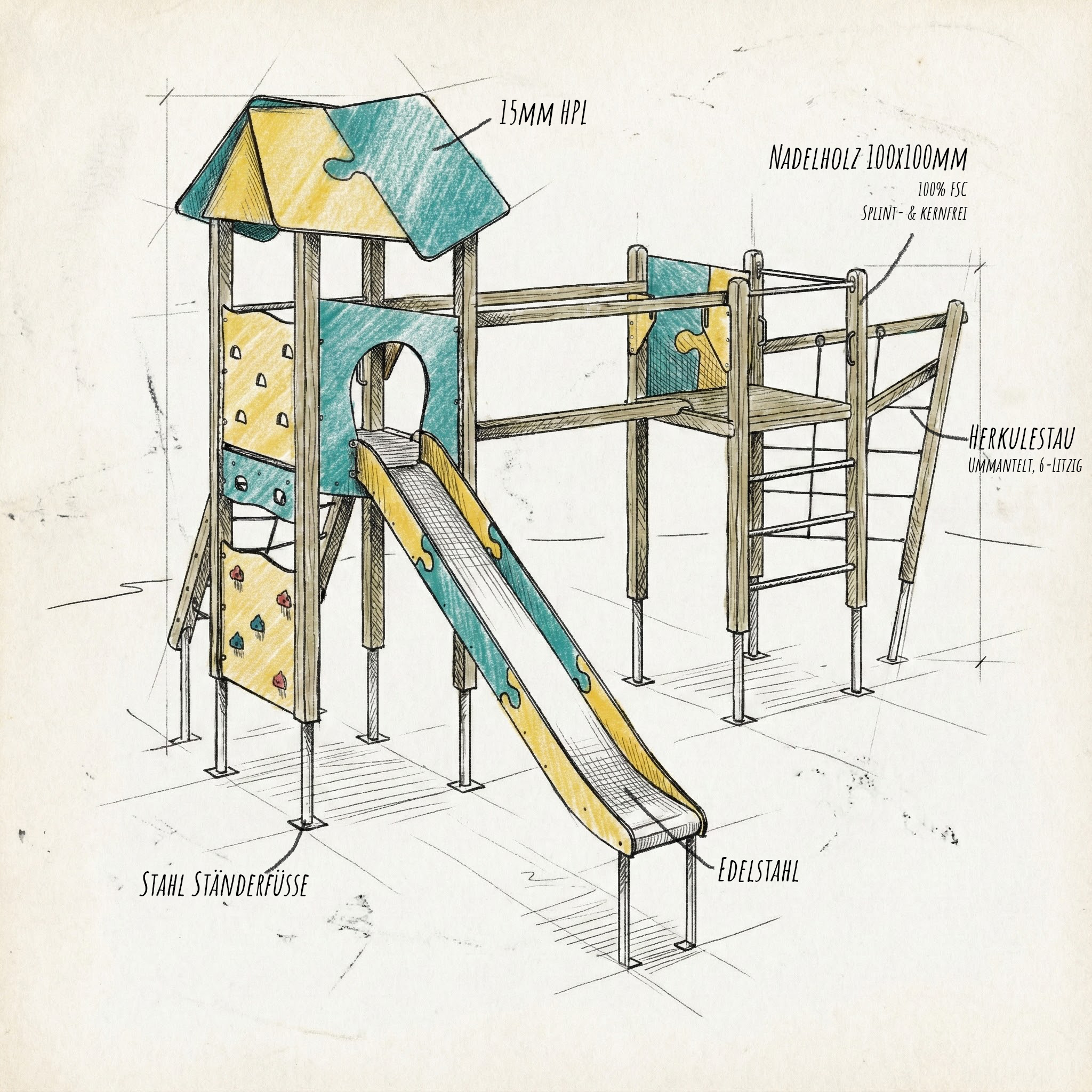 Die PUDSEL-Serie zeichnet sich durch ihr unverwechselbares Puzzle-Design aus. Klare Konturen und grafische Formen schaffen eine fröhliche, kindgerechte Optik, die auf jedem Spielplatz sofort ins Auge fällt. Gefertigt aus stabilem Nadelholz und wetterfestem HPL, bietet die Serie eine langlebige und gleichzeitig sympathische Lösung für Kindergärten, Schulhöfe und öffentliche Anlagen.